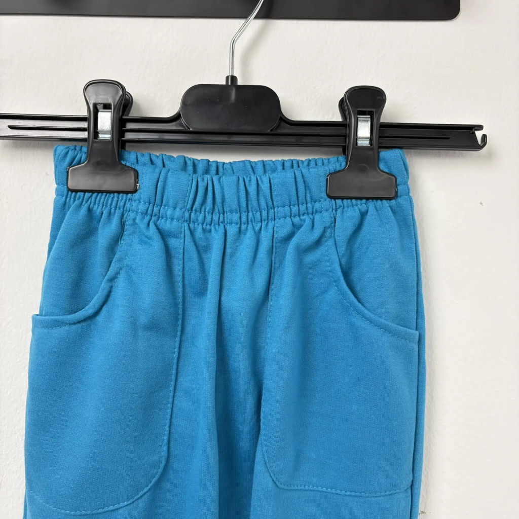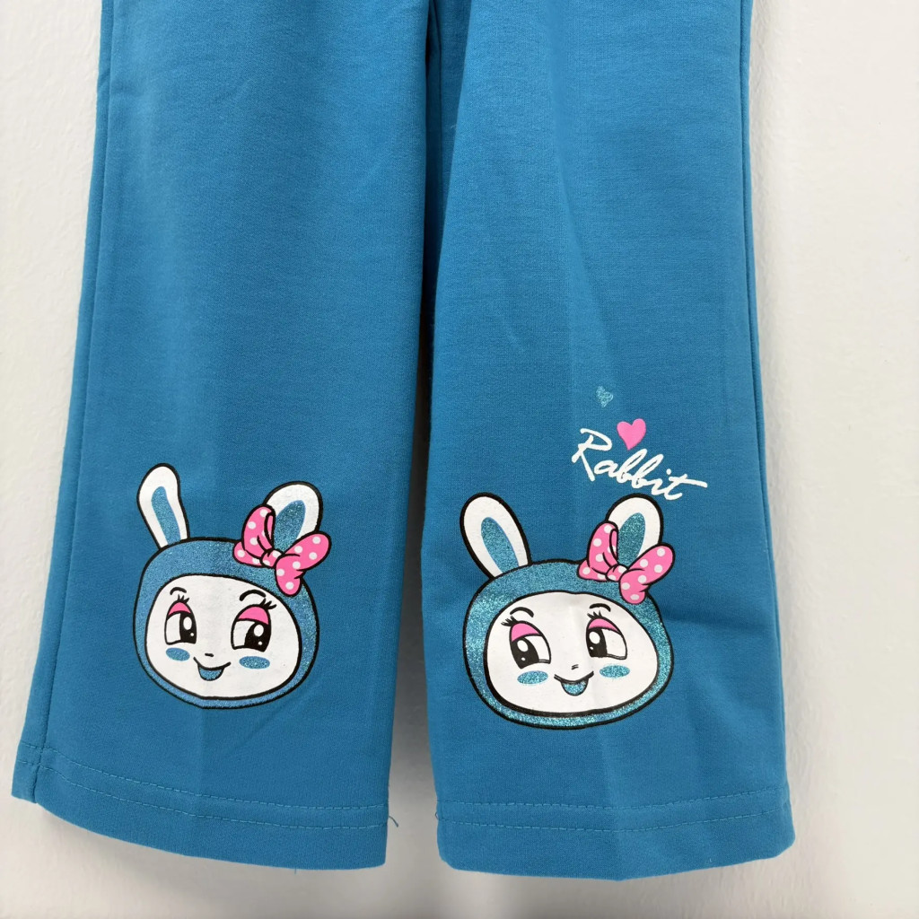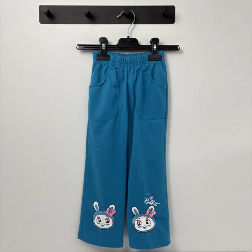 Kényelmes, puha tapintású Arino melegítőnadrág kék színben, 98-104-es méretben. Alján nyuszis mintával díszítve.