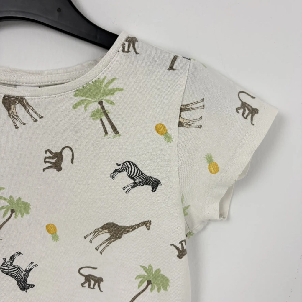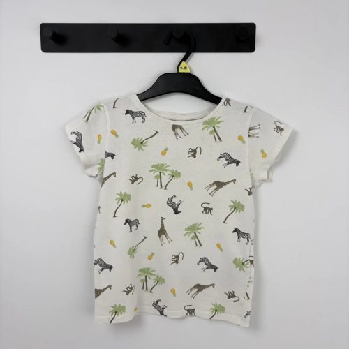 Vidám, fehér alapon Safari állatokkal mintázott lány póló 116-os méretben. Kényelmes anyagból készült, ideális mindennapi viselet iskolába vagy hétvégi programokra.