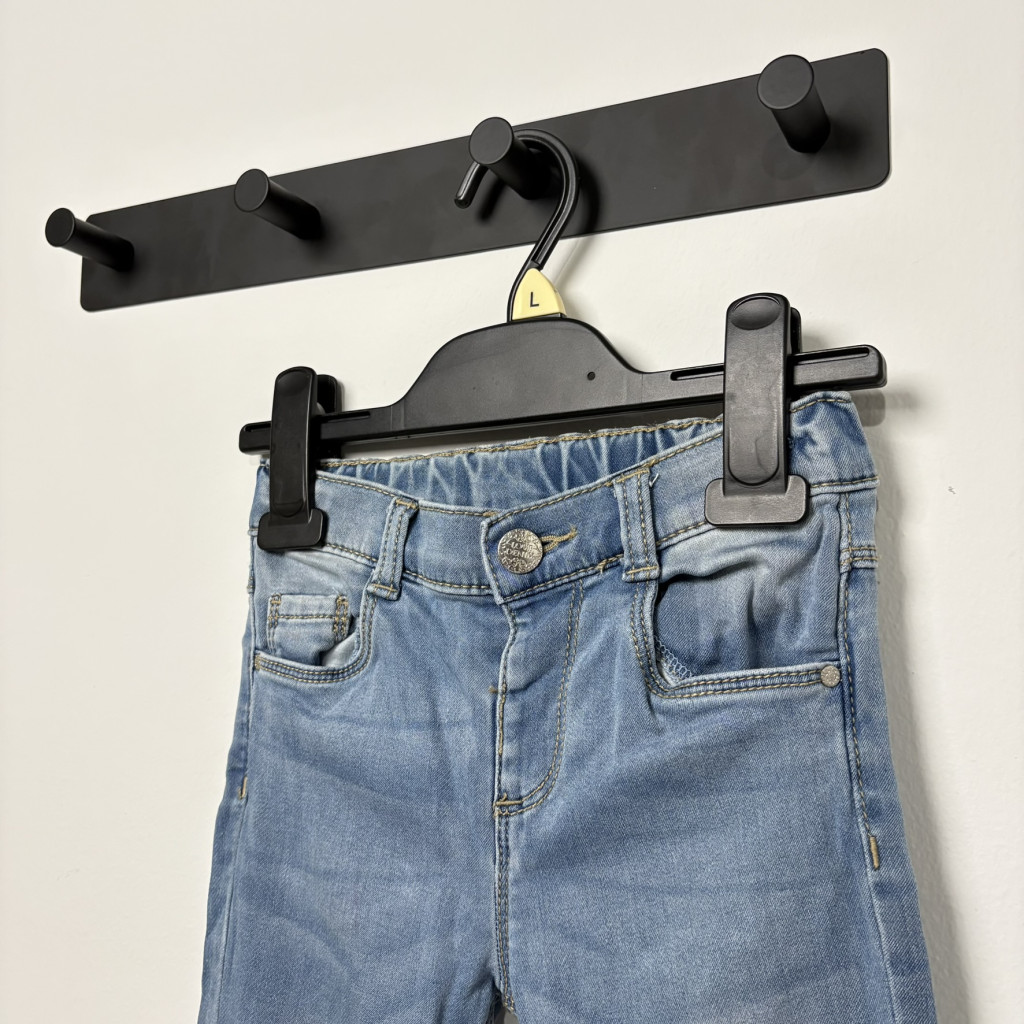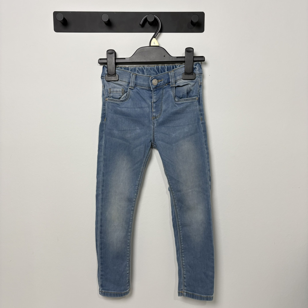 Világoskék koptatott mintás lány farmernadrág 110-es méretben az F&F-től. Állítható derekú, elöl és hátul zsebes.