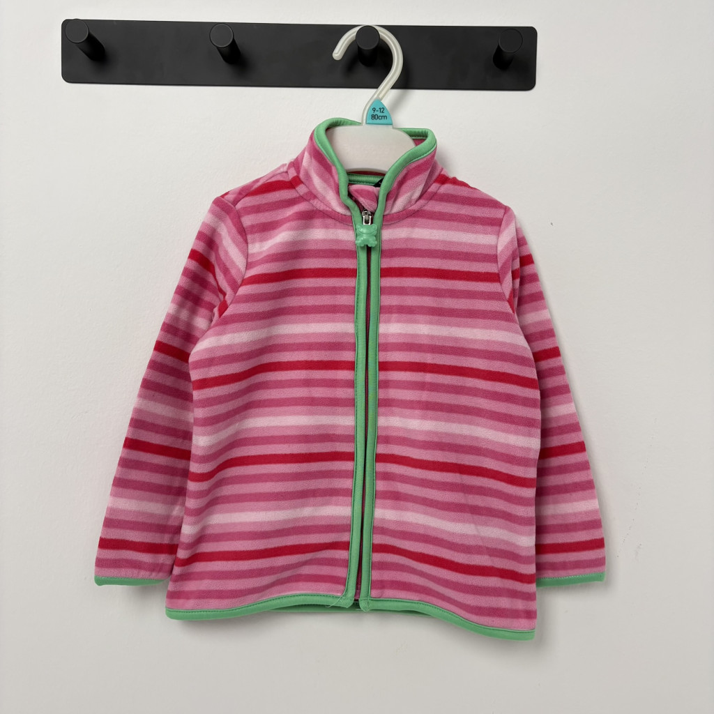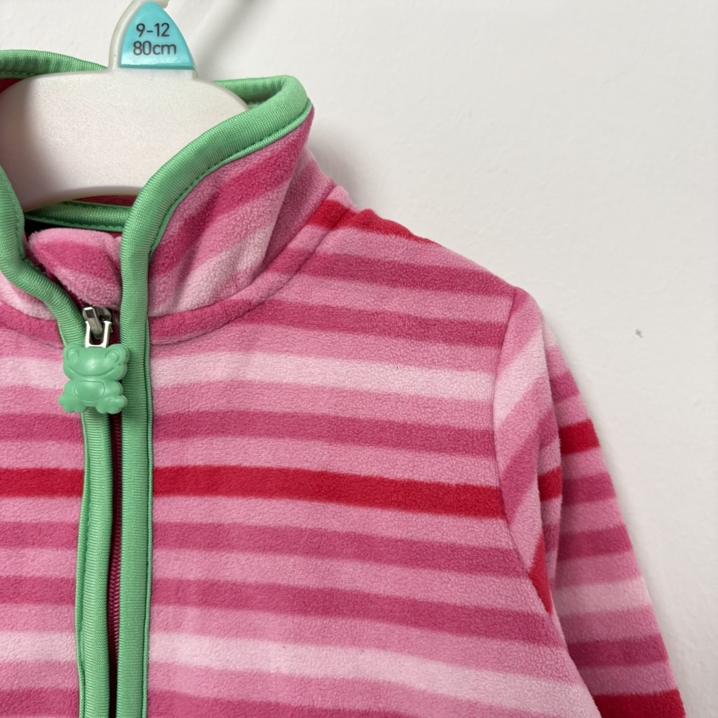 Rózsaszín csíkos lány polár pulóver 86-92-es méretben, békás cipzárral.