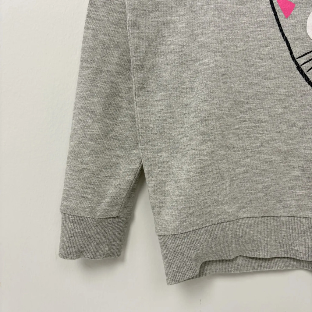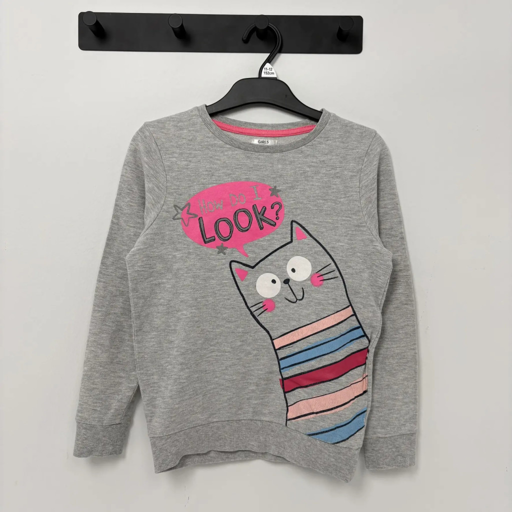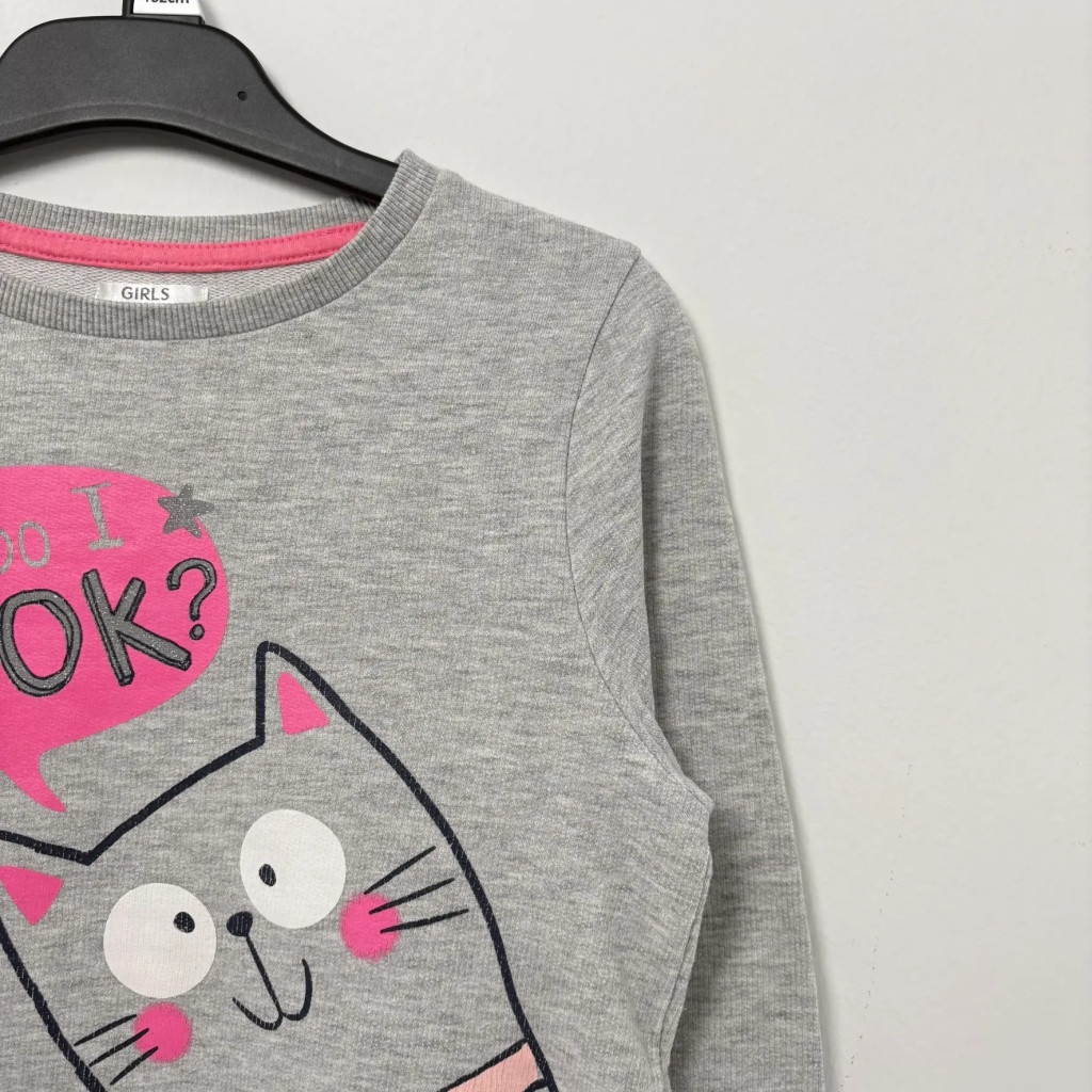 Szürke alapon vidám cicás lány pulóver 128-as méretben.