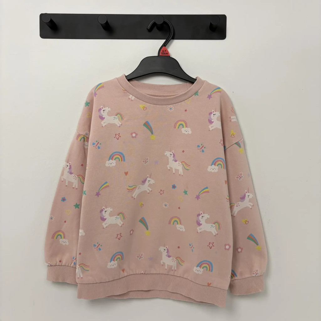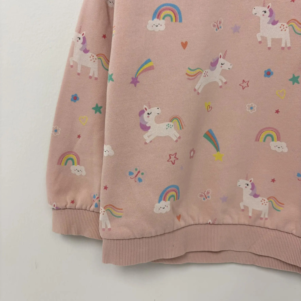Halvány rózsaszín színű unikornis mintás lány pulóver az F&F-től 116-os méretben.